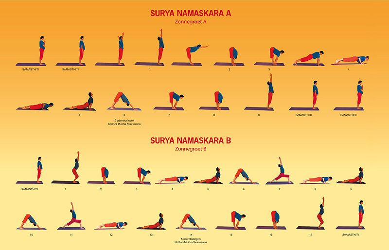 Reeks van 32 asana’s met op de achterkant de zonnegroeten A en B. Recto-verso in kleur.
