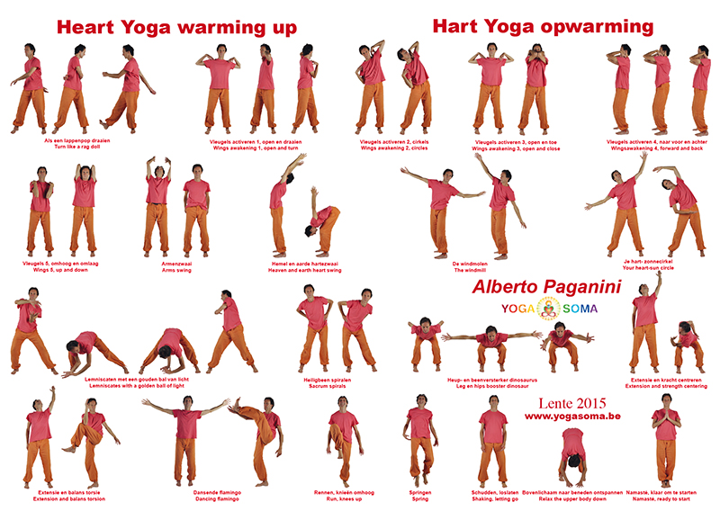 Intro met de basisprincipes van Hart yoga en 18 verschillende opwarming oefeningen met foto’s, beschrijving, uitwerking op lichaam en geest en affirmaties.  Inclusieve afneembare kleurenfoto plaat op A4 met alle oefeningen op een rij. (Auteur Alberto Paganini).